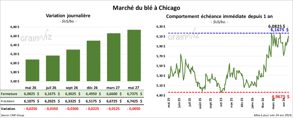 À Chicago, le contrat de blé mai 26 a clôturé à 6,0825 $ (- 2 ½ cents). Celui de juillet 26 a fermé à 6,1675 $ (- 3 ½ cents). Celui de septembre 26 a terminé à 6,3025 $ (- 3 cents).