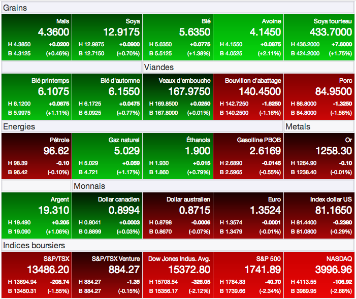 Les marchés boursiers sont nerveux et préoccupés par de nombreuses incertitudes économiques qui planent sur certains pays, notamment aux États-Unis et en Chine, mais également dans plusieurs pays émergeant. Aujourd’hui, les principaux indices boursiers américains ont témoigné de cette nervosité en reculant de manière importante, le Dow Jones de 2,12% et le S&P 500 de 2,34%.