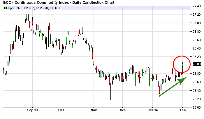 Délaissant les marchés boursiers, les investisseurs et fonds d’investissement se sont à nouveau tourné vers ceux des commodités, contribuant à les raffermir comme le révèle bien le comportement du « Continuous commodity index », un indice de référence qui présente un bon aperçu de l’ensemble des fluctuations de plusieurs commodités tel que le maïs, le soya et le blé, mais également l’or, le cuivre et le pétrole. (Wikipedia - Continuous Commodity Index)