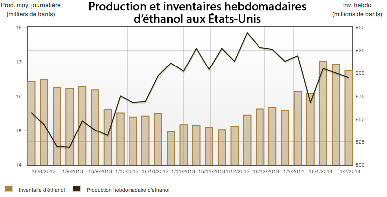 Le rapport hebdomadaire sur la production d’éthanol américain montre une baisse à 895 000 barils par jour comparativement à 900 000 barils par jour la semaine précédente. Quant aux inventaires d’éthanol américain, ils ont baissé, passant de 16.932 à 16.739 millions de barils. Étant donné les conditions hivernales qui touchaient la semaine dernière le Midwest et les Plaines américaines et qui ont ralenti les transports, on peut croire cependant que la demande pour l’éthanol reste malgré tout assez forte. C’est du moins ce que les analystes pensent.