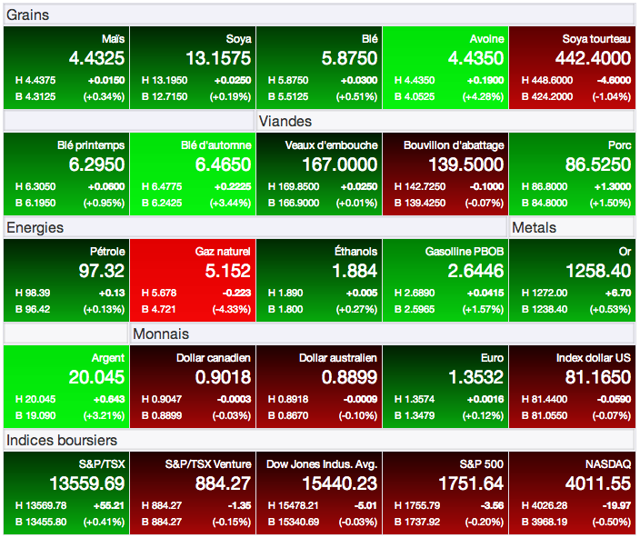 Le marché du blé à Chicago a clôturé pour une 5e journée consécutive à la hausse, supporté par des couvertures de positions et un contexte de marché techniquement favorable. Le contrat à terme pour livraison immédiate a gagné 0.030 $US/boisseau pour clôturer à 5.88 $US/boisseau (+ 1.10 à 215.87 $US/tm), sa fermeture la plus élevée depuis la publication des rapports du USDA le 10 janvier dernier. En ce qui concerne le contrat à terme de la récolte (septembre 2014), il a également grimpé de 0.030 $US/boisseau pour franchir le cap de 6,00 $US/boisseau à 6.02 $US/boisseau (+ 1.10 à 221.02 $US/tm).