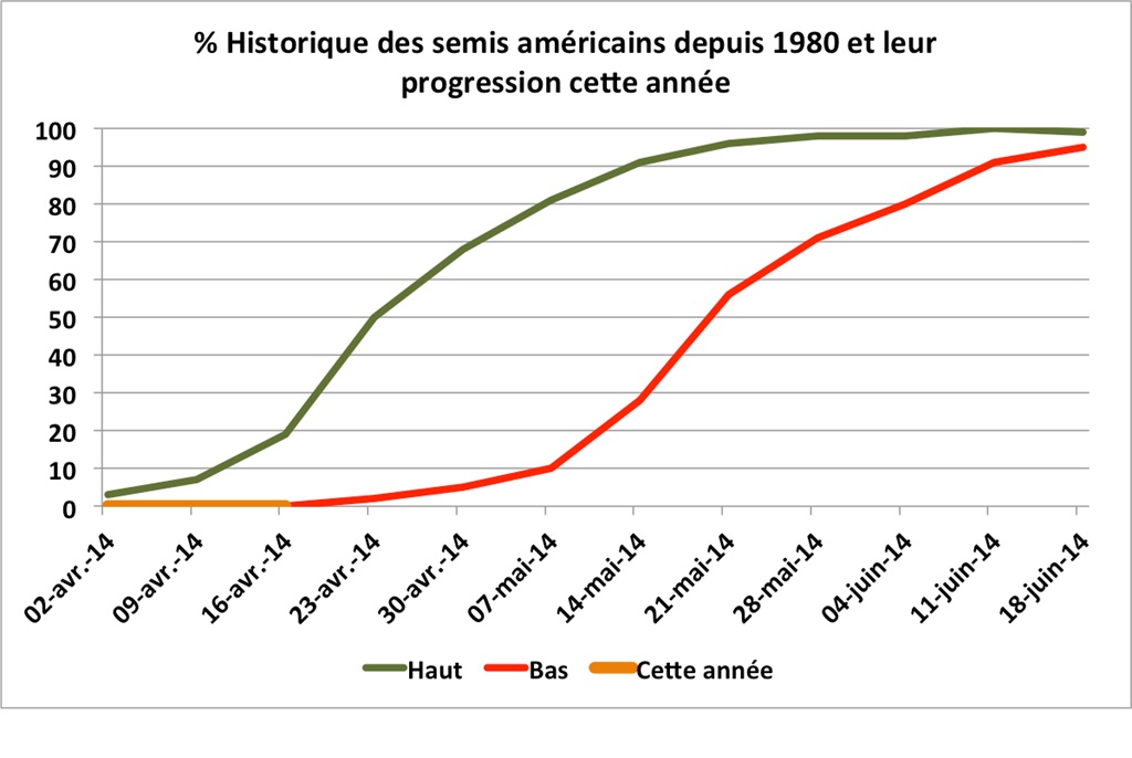 Selon le dernier rapport sur la progression des semis américains publié avec une journée de retard mardi, en date de dimanche dernier, aucune progression significative n’était à signaler. Les marchés seront particulièrement curieux maintenant de voir ce que la dernière semaine aura permis comme avancé dans le prochain rapport du USDA de lundi prochain (Crop progress). Mais ce qui ne fait aucun doute jusqu’ici, c’est que les ensemencements sont pour l’instant retardés, offrant un support particulièrement intéressant au prix du maïs.