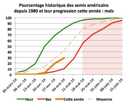 Le marché du maïs a réalisé un revers intéressant aujourd’hui, profitant des retards dans les semis américains et de la fermeté du marché du blé. Sur le contrat à terme pour livraison immédiate (juillet 14), il sera parvenu à se rétablir au-dessus du cap du 5,00 $US/boisseau, progressant de +0,0950 à 5,1750 $US/boisseau (+3,74 à 204 $US/tonne). Sur le contrat à terme de la prochaine récolte (décembre 14), le rebond aura été également très intéressant avec un gain pour la journée de +0,0950 à 5,0950 $US/boisseau (+3,74 à 200,5 $US/tonne).