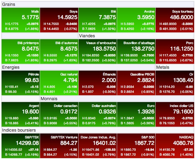 Le marché du soya a réalité tout qu’un revers aujourd’hui. Après un recul de près de 0,25$US/boisseau au cours de la nuit dernière, il sera parvenu à essuyer une bonne part de ses pertes pour clôturé avec un recul beaucoup plus modéré. Sur le contrat à terme pour livraison immédiate (juillet 14), il a terminé en baisse de -0,0375 à 14,5950 $US/boisseau (-1,38 à 536 $US/tonne). Sur le contrat à terme de la prochaine récolte (novembre 14), il a reculé de -0,0225 à 12,2525 $US/boisseau (-0,83 à 450 $US/tonne).