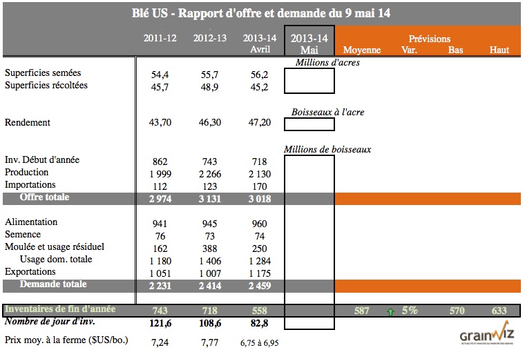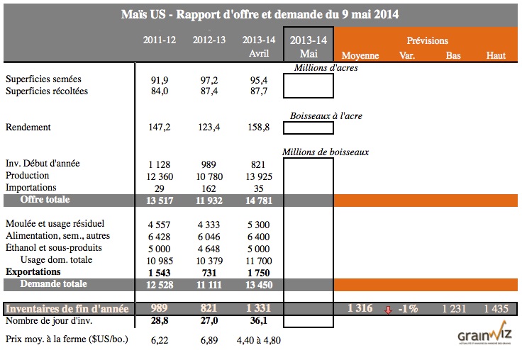 Ce vendredi 9 mai, le USDA publiera à midi son rapport mensuel d’offre et demande de grains aux États-Unis et dans le monde. Les résultats de ce rapport seront particulièrement intéressants. Non seulement ils pourraient jeter un nouveau regard sur la précarité ou non des inventaires américains d’ici l’automne prochain, mais ils révèleront également de premiers chiffres pour la prochaine récolte, l’année commerciale 2014-15.