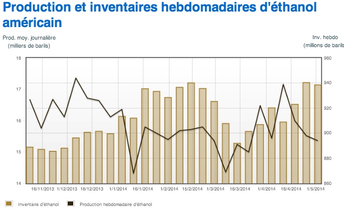 Selon le dernier rapport hebdomadaire de l’EIA (Energy Information Administration) aux États-Unis, la production d’éthanol a à nouveau reculé la semaine dernière à 894 000 barils/jour. Les inventaires d’éthanol ont par contre reculé à 17,1 millions de barils. On rapporte que les marges de profit des usines d’éthanol qui étaient très fortes depuis le début de l’année commencent à s’amincir.