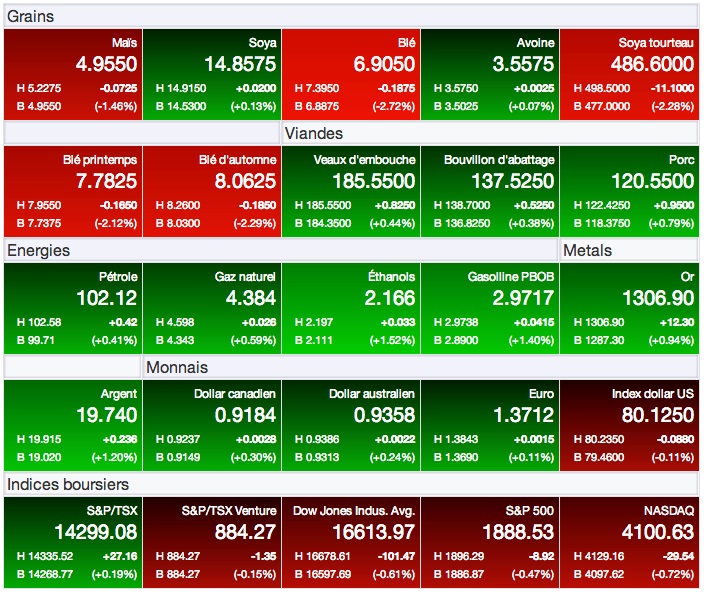Les prix du maïs sont retournés à la baisse aujourd’hui, mettant à nouveau à l’épreuve leurs creux d’avril dernier. Sur le contrat à terme pour livraison immédiate (juillet 14), il a reculé de -0,0725 à 4,9550 $US/boisseau (-2,85 à 195 $US/tonne). Sur le contrat à terme de la prochaine récolte (décembre 14), la baisse a été de -0,06 à 4,89 $US/boisseau (-2,36 à 192,5 $US/tonne).