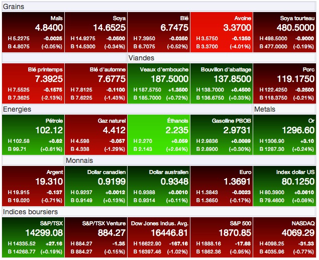 Le soya sera parvenu, mais non sans difficultés, à éviter l’atteinte de nouveaux creux cette semaine. Ceci ne l’aura pas empêché de terminer sur une note partagée. Sur le contrat à terme pour livraison immédiate (juillet 14) il a reculé de -0,0525 à 14,65 $US/boisseau (-1,93 à 538 $US/tonne). Sur le contrat à terme de la prochaine récolte (novembre 14), il a par contre gagné +0,0375 à 12,2150 $US/boisseau (+1,38 à 449 $US/tonne).