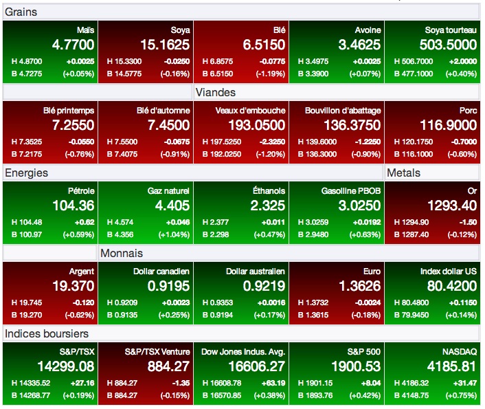Pour sa part, avec le retour d’averses qui étaient très attendues dans le centre et le sud des Plaines américaines, le marché du blé ne sera tout simplement pas parvenu encore à trouver une assise sur laquelle s’appuyer pour freiner sa chute amorcée depuis maintenant deux semaines. Sur le contrat à terme du blé pour livraison immédiate (juillet 14) à Chicago, le recul s’établit maintenant à plus de 12%. Et, malheureusement, peu d’éléments semblent vouloir se mettre pour l’instant pour freiner ce recul. Seule incertitude à surveiller, les ensemencements de blé de printemps qui tardent dans le nord du Midwest américain.