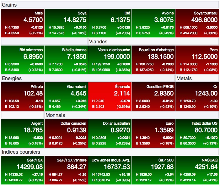 Suivant le recul depuis le début de la semaine, les marchés semblent avoir pris une pause aujourd’hui. Les prix ont reculé de manière importante le mois dernier à l’exception du soya qui aura toutefois lâché prise dans les derniers jours. Avec de tels reculs, plusieurs estiment maintenant que les prix sont mûrs pour un rebond à la hausse, spécialement ceux du maïs et du blé qui sont techniquement « survendu ».