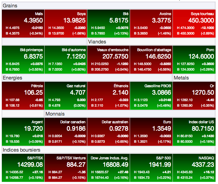 Des côtés du maïs et du blé, le contexte reste lourd. Par contre, en l’absence de nouvelles et avec leur recul important des dernières semaines, une certaine hésitation des marchés à les forcer davantage à la baisse se fait sentir depuis quelques jours. Il faudra toutefois sans aucun doute beaucoup plus de nouvelles positives pour les supporter davantage et les amener à renverser la vapeur à la hausse. Pour l’instant, ces marchés restent très fragiles et le prix du maïs aura à nouveau testé des creux inégalés depuis janvier dernier aujourd’hui à 4,3550 $US/boisseau sur le juillet 14, et 4,3625 $US/boisseau sur le contrat à terme de la prochaine récolte (décembre 14).