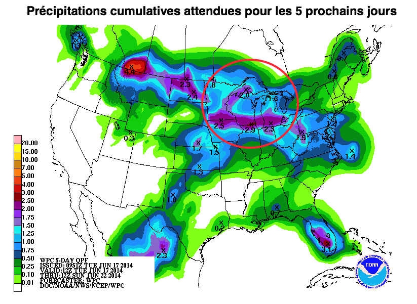 Les dernières prévisions se veulent toujours profitables pour les cultures dans le Midwest américain, bien que certaines préoccupations grandissantes entourent les précipitations (et mêmes inondations) importantes qui touchent la portion plus au nord (Minnesota et Wisconsin). Le retour de conditions plus sèches reste cependant en vue à partir de la fin de cette semaine/début de la semaine prochaine.
