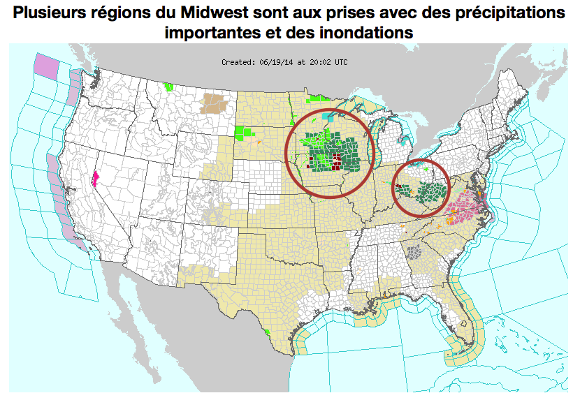 Journée intéressante pour le marché des grains qui a été très malmené depuis de nombreuses semaines. Aux États-Unis, les averses importantes qui touchent actuellement la portion plus au nord et au centre-est du Midwest américain préoccupent de plus en plus. De nombreuses inondations et avertissement d’inondation sont en vigueur. Sur les réseaux sociaux tels que Twitter, certaines images retransmises sont impressionnantes.