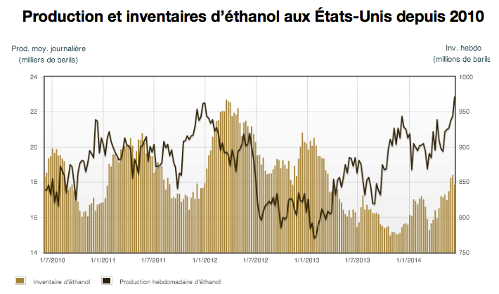 Dans son rapport hebdomadaire publié hier, l’EIA (Energy Information Administration) a révélé que la production d’éthanol avait à nouveau atteint un nouveau sommet de 972 000 barils/jour la semaine dernière. Profitant de la fermeté des exportations d’éthanol qui sont pratiquement à leur plus haut sur une base mensuelle depuis 2011 et des incertitudes entourant l’Irak, les inventaires américains d’éthanol sont également de retour à la baisse à 17,87 millions de barils après avoir atteint un sommet inégalé depuis le début 2013 il y a deux semaines.