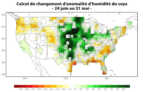 Côté météo, un autre coup d’eau est attendu dans certaines régions déjà détrempées du nord-est du Midwest américain dans les prochains jours. Comme le montre bien la carte des changements anormaux d’humidité dans le sol ci-joint, l’ensemble du Midwest et des Plaines américaines auront été quitte pour une quantité très importante de précipitations au cours du dernier mois.