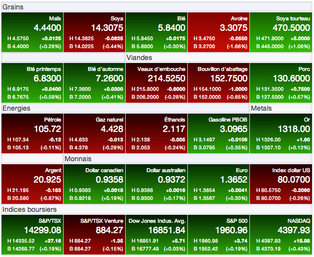 De son côté, le soya a repris son souffle après avoir atteint des sommets hier. Profitant de la tendance à court terme haussière que supporte toujours la demande surprenante à l’exportation de soya américain, le prix du soya de l’ancienne récolte sera parvenu a afficher un gain net de 0,15 $US/boisseau par rapport à sa fermeture d’il y a une semaine pour terminer à 14,3075 $US/boisseau. Par contre, même s’il demeure aussi sur une tendance haussière à court terme, le contrat à terme du soya de la prochaine récolte (novembre 14) a pour sa part légèrement reculé depuis vendredi dernier de -0,04 à 12,2750 $US/boisseau.