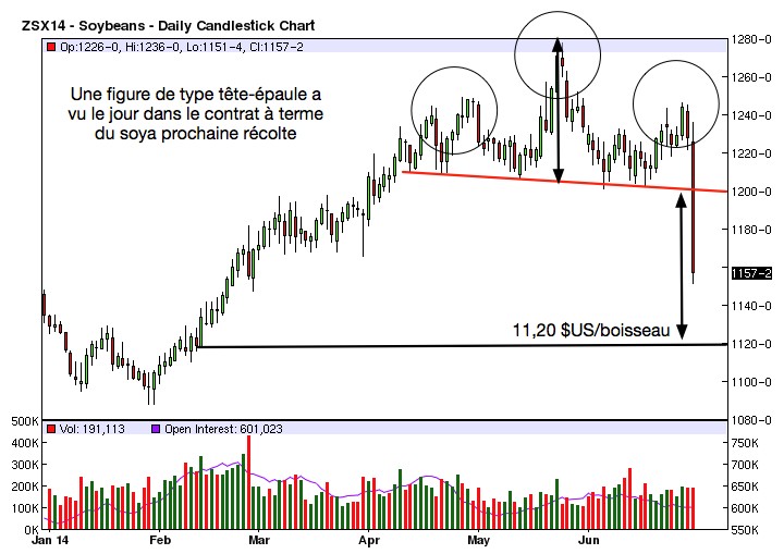 C’est donc un double « uppercut » qui a mis K.O. le marché du soya et, techniquement, le portrait n’est pas très reluisant il va sans dire. Sur le contrat à terme pour livraison immédiate (août 14), il est passé sous son support des dernières semaines à 13,40 $US/boisseau pour maintenant naviguer tout juste au-dessus d’un second support à 13,20 $US/boisseau. Pour la prochaine récolte (novembre 14), il a brisé fermement l’important support psychologique de 12,00 $US/boisseau. Une figure de type tête-épaule identifiée par plusieurs analystes suggère que le contrat à terme devrait à partir d’ici reculer tout au moins jusqu’à 11,20 $US/boisseau.