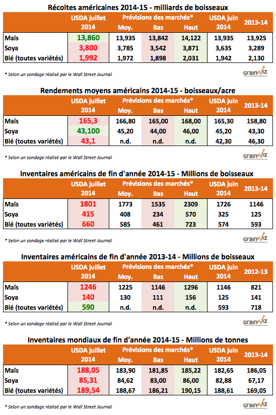 Blé – Malgré la récolte difficile de blé d’hiver, le USDA prévoit une récolte globale de blé américain un peu plus importante qu’en juin à 1,992 milliards de boisseaux. Les inventaires de fin d’année américaine sont également réajustés en hausse à 660 millions de boisseaux, un résultat supérieur aux attentes des marchés. Dans le monde, la récolte aussi est estimée légèrement à la hausse à 189,54 millions de tonnes contre 188,61 millions de tonnes le mois dernier.
