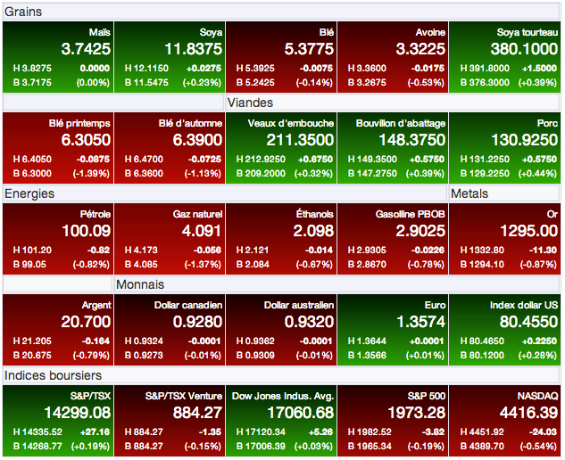 Le prix du maïs a effacé toute trace de son rebond d’hier aujourd’hui. Sur le contrat à terme de l’ancienne récolte (septembre 14), il a reculé de -0,0750 pour clôturer à un nouveau creux à 3,74 $US/boisseau. Sur le contrat à terme de la prochaine récolte (décembre 14), il a perdu -0,0650 à 3,8825 $US/boisseau.