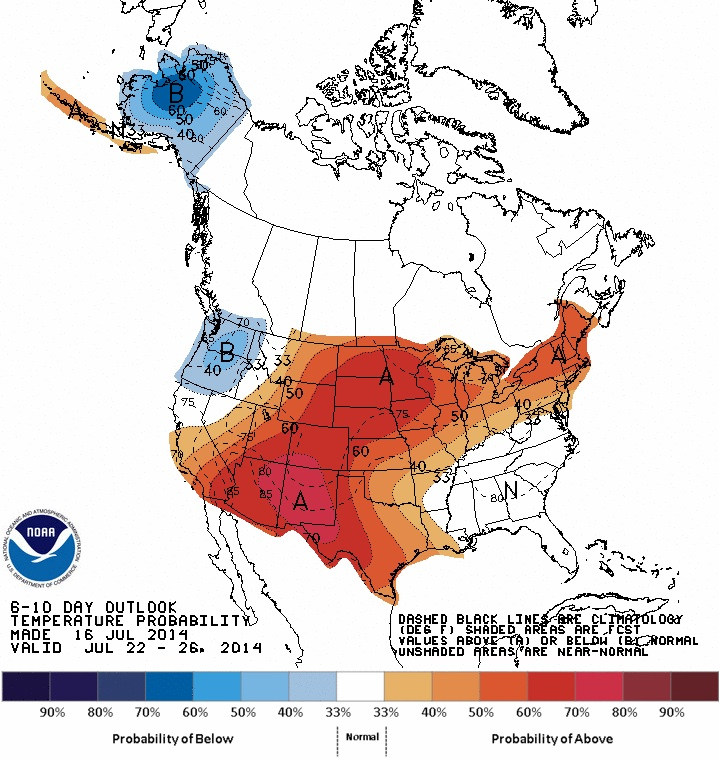 Bien qu’après plusieurs semaines sous des conditions fraîches et excessivement humides dans certaines régions, des températures plus chaudes ne soient pas nécessairement une mauvaise chose pour les cultures, les marchés gardent à l’esprit l’incroyable sècheresse de 2012 et le début de sècheresse d’août dernier. Même si un retour à des conditions plus fraîches est déjà prévu pour la fin de la semaine prochaine, ces prévisions auront jeté un doute suffisant dans l’esprit des marchés pour les inciter à la prudence.