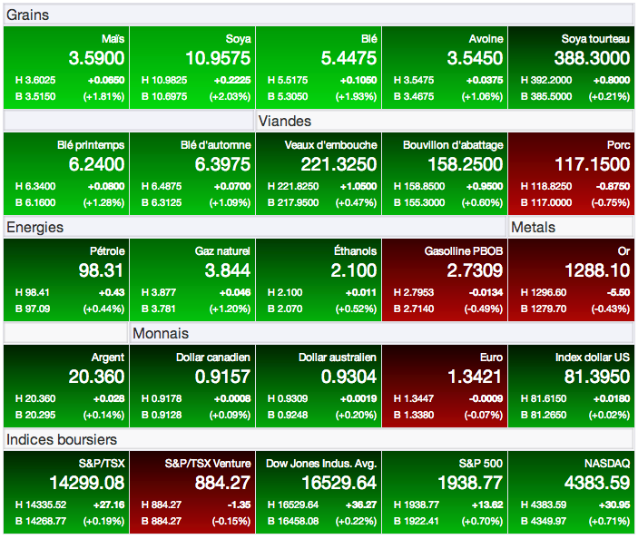 Sur le contrat à terme de l’ancienne récolte (septembre 14), il a bondi de +0,1750 à 12,3250 $US/boisseau. Sur le contrat à terme de la prochaine récolte (novembre 14), il a progressé de +0,21 à 10,7950 $US/boisseau.