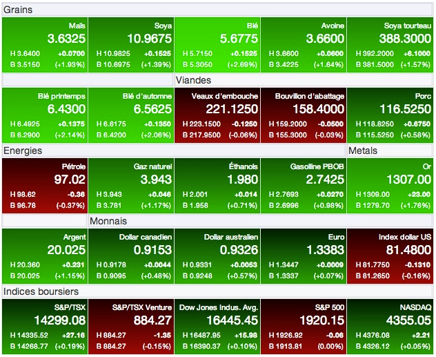 Sur le contre à terme courant (sept. 14), il a bondi de +0,1525 à 5,68 $US/boisseau, sur le 1er contrat à terme de l’hiver (décembre 14), il a grimpé de +0,14 à 5,8675 $US/boisseau.
