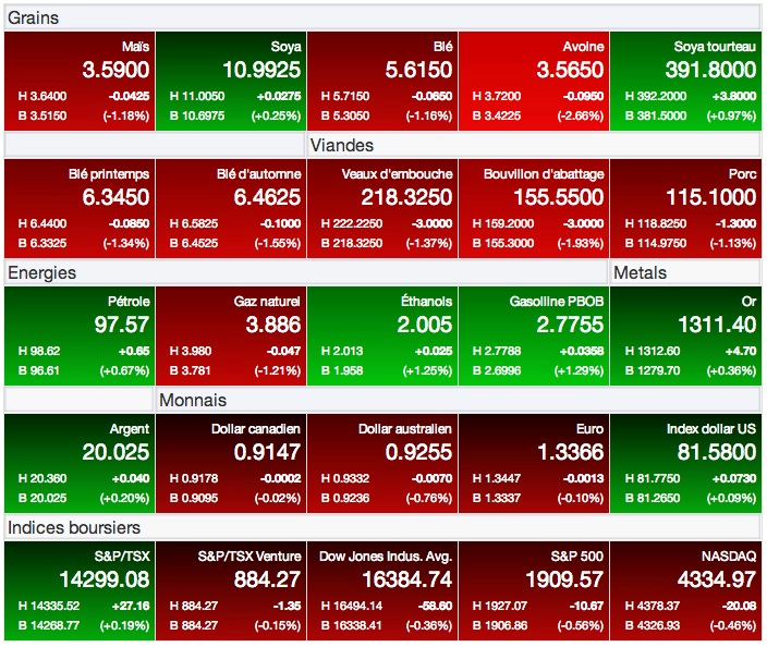 Les prix des grains jouent du yo-yo. Suivant un rebond hier, ils sont retournés à la baisse aujourd’hui, les dernières prévisions météo se voulant plus prometteuses pour les cultures du Midwest américain. Les marchés se positionnent également en vue du prochain rapport mensuel du USDA qui sera publié le mardi 12 août prochain, et tout indique que les attentes sont élevées.