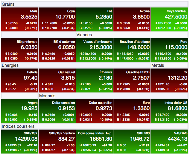 Mi-chaud, mi-froid, ces résultats auront amené les marchés a faire progresser les prix du maïs, mais de manière encore très conservatrice. Aujourd’hui, le contrat à terme de l’ancienne récolte (septembre 14) a reculé de -0,05 à 3,58 $US/boisseau. Celui de la prochaine récolte (décembre 14) a gagné pour sa part +0,75 à 3,6975 $US/boisseau.