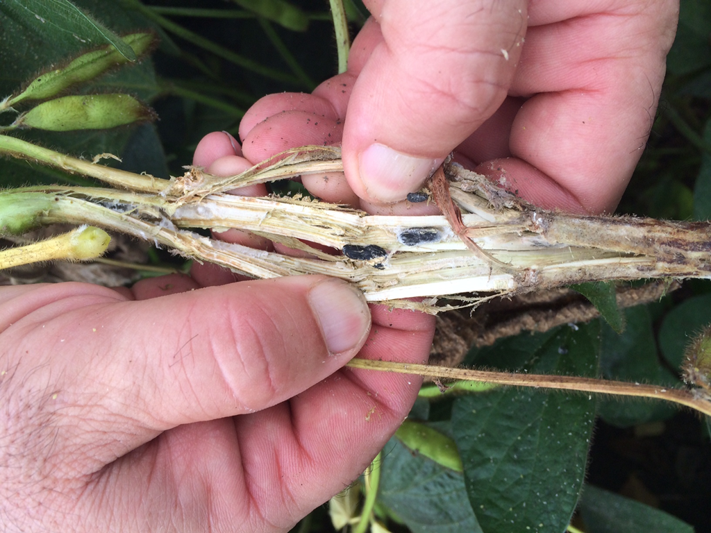Dans le soya, la moyenne du décompte de gousses sur 3 pieds par 3 pieds est de 1 078. Par contre, de l’avis général, les résultats sont très variables. Certains échantillons ont été d’aussi peu que 632 gousses, alors que d’autres ont dépassé 1 350 gousses. Dans tous les cas, toutes les équipes ont signalé la présence importante de moisissure blanche et/ou encore de pucerons.