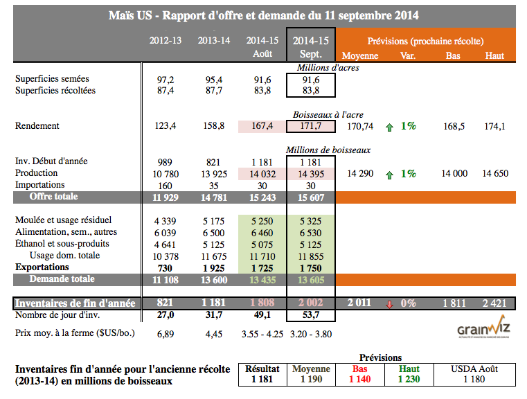 - Ceci porte la récolte américaine de maïs à un nouveau record de 14,395 milliards de boisseaux.