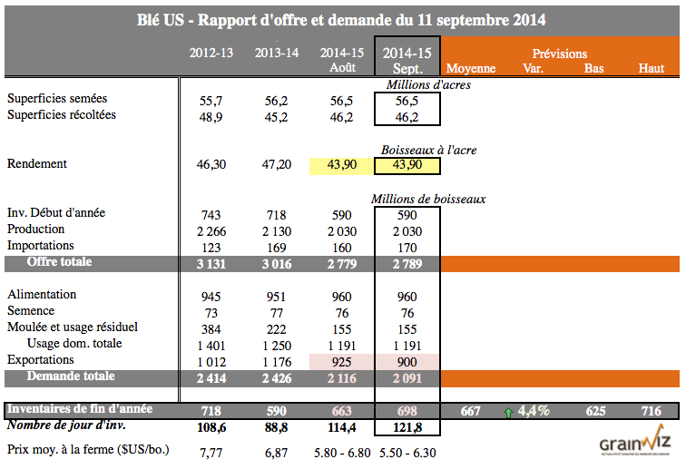 De l'avis du USDA, le prix moyen à la ferme pour le blé aux États-Unis sera de 5,50 à 6,30 $US/boisseau (222 à 255 $CAN/tonne).