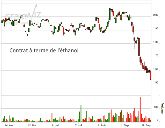 Aujourd’hui, c’est au tour du rapport de l’EIA (Energy Information Administration) d’y être allé avec des nouvelles préoccupantes pour le marché du maïs. Selon l’institution, la production d’éthanol aux États-Unis a à nouveau chuté la semaine dernière, passant de 889 000 à 881 000 barils/jour, soit un deuxième recul consécutif sous la barre du 900 000 barils/jour. À pareille date l’an dernier, la production quotidienne d’éthanol évoluait autour de 875 000 barils/jour. Ce recul de production n’est pas étranger à la faiblesse du prix de l’éthanol lui-même qui a perdu plus de25% de sa valeur depuis la mi-août et que le recul du prix du maïs ne peut à lui seul amortir pour éviter un affaiblissement des marges de profit des fabricants d’éthanol. Mais ce qui est d’autant préoccupant pour l’industrie de l’éthanol, ce sont les inventaires du biocarburant qui ne cessent de leur côté de grimper, reflétant une faiblesse du côté de la demande.