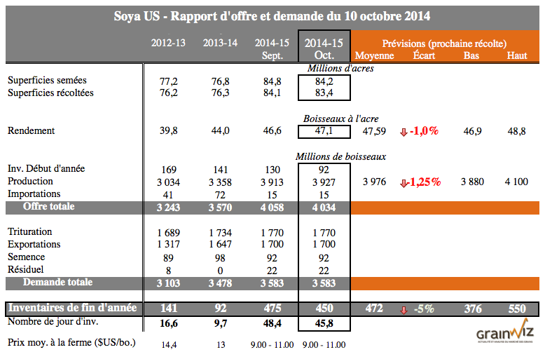 Dans le cas du soya, la consommation reste inchangée. Cependant, malgré la nouvelle prédiction de récolte record, un réajustement à la baisse des inventaires de début d’année 2014-15 en raison du niveau historiquement bas des réserves au cours de 2013-14 fait en sorte que les inventaires de fin 2014-15 sont de moindre importance que ce que prévoyaient les marchés.