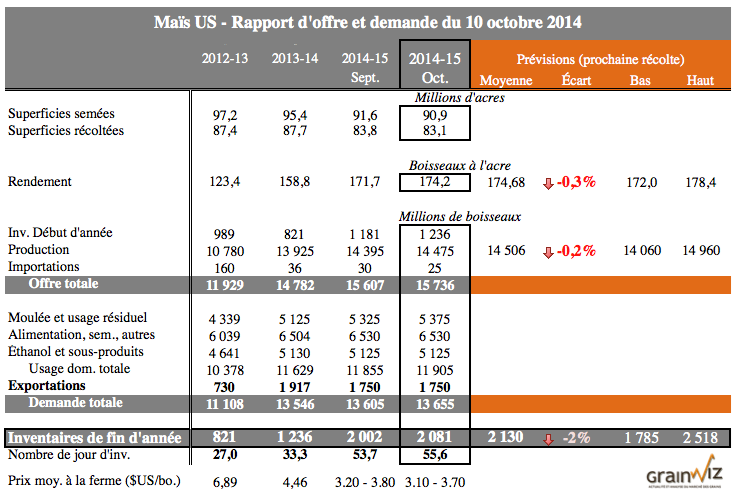 Dans le maïs et le blé, des révisions à la hausse de la consommation prévue pour la prochaine année font en sorte de tempérer légèrement le réajustement à la hausse des inventaires américains pour la fin 2014-15.