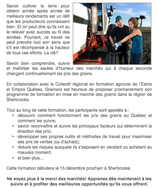 Pour ceux et celles qui aimeraient participer, mais ne sont pas dans la région de Sherbrooke, Grainwiz propose cette formation depuis déjà deux ans dans toutes les régions du Québec, et même en Ontario. Si vous désirez en savoir plus sur la possibilité d’une formation dans votre région, contactez-nous.
