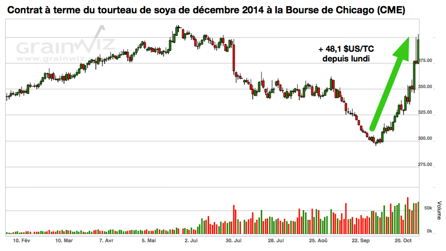 Le rallye se poursuit dans le marché des grains, le tourteau de soya captant toujours toute l’attention des marchés avec un bond pour le moins exceptionnel depuis le début de la semaine.