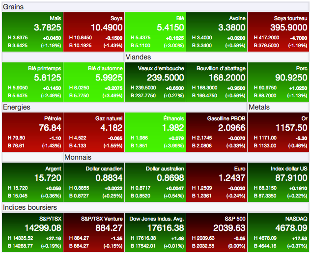 Mentionnons en terminant que du côté du blé, le marché semble à nouveau prendre du tonus. Les tensions géopolitiques entre l’Ukraine et la Russie font à nouveau les manchettes. On rapporte que des forces militaires russes auraient fait intrusion en Ukraine. (L'Ukraine se prépare au combat - LaPresse.ca) La vague de froid aux États-Unis a également contribué à raffermir le marché, bien que jusqu’ici on ne s’attend pas à d’importants dommages liés au gel sur les cultures de blé d’hiver.