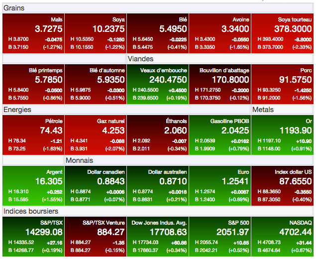 Le marché des grains a terminé en territoire négatif aujourd’hui. Suivant la dernière semaine riche en informations à digérer pour les marchés, jusqu’ici peu de nouvelles auront vu le jour depuis lundi. Ceci laisse peu de chose à mettre sous la dent des fonds spéculatifs qui, de pair avec les problèmes entourant la disponibilité de soya et tourteau de soya aux États-Unis, ont grandement contribué au rallye des prix des dernières semaines.