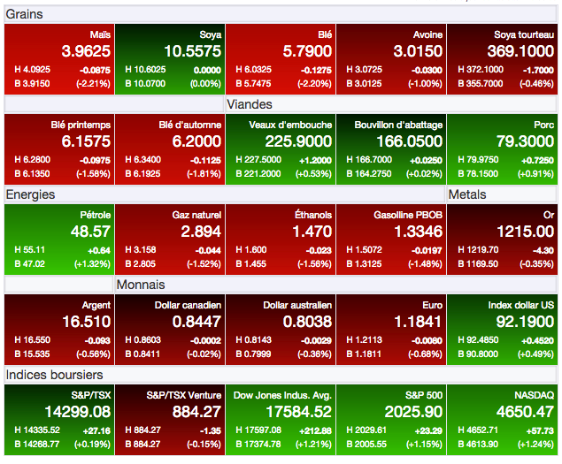 Le marché du blé a pour sa part connu une journée plus difficile après un début de semaine intéressant. L’annonce d’une vague de froid appréhender pour le Midwest américain qui a animé les marchés depuis lundi semble maintenant avoir été bien intégrée aux prix. Certains spécialistes soulignent également que les dommages occasionnés aux cultures de blé d’hiver devraient être minimaux, un bon couvert de neige aidant dans la plupart des régions affectées.