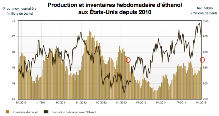Ce qui préoccupe davantage, c’est cependant la hausse importante des inventaires américains d’éthanol qui, à 18,8 millions de barils, laisse présager un ralentissement de la demande inquiétant. Après plusieurs semaines à des niveaux exceptionnellement bas à l’automne, ceux-ci sont maintenant à leur plus haut niveau depuis mars 2013.