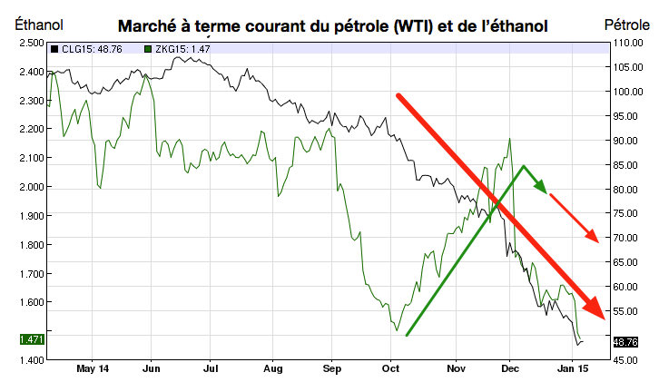 Comme l’illustre le graphique ci-haut, jusqu’au début de décembre, l’industrie de l’éthanol avait pu échapper au recul exceptionnel du prix du pétrole grâce à la fermeté de la demande d’éthanol et à son prix qui avait su garder le cap envers et contre tout. Mais, le vent a tourné dans les dernières semaines, et il semble que cette fois-ci, les marges de profit des fabricants d’éthanol écopent.