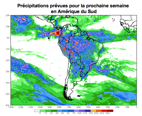 Selon les dernières prévisions (graphique ci-haut), des précipitations devraient cependant couvrir pratiquement l’ensemble du Brésil au cours de la prochaine semaine.