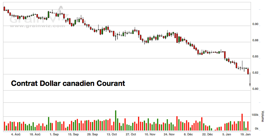 Cette mesure a occasionné une chute précipitée du dollar canadien qui a effleuré aujourd’hui 0,8000. Rappelons qu’il n’y a encore que quelques semaines, pour débuter 2015, le dollar se transigeait à 0,86, et qu’il a ouvert ce lundi à un peu plus de 0,83. Généralement, un affaiblissement de la valeur du dollar canadien supporte une appréciation de la « base » (du prix…) proposée aux producteurs vendeurs de grains.