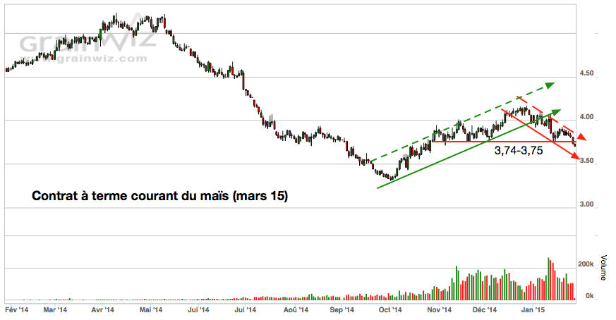 Techniquement, la tendance baissière amorcée en décembre reste effective. Hier, un support important a été brisé, non sans toutefois quelques hésitations. En principe, une porte est donc maintenant ouverte pour un recul vers un peu plus de 3,50 $US/boisseau, avec quelques légers supports préalables.