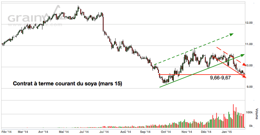 Difficile actuellement de bien percevoir la direction que suivra le marché du soya. Il ne fait aucun doute que 2015 est à l’abondance, avec des stocks inégalés depuis une dizaine d’années aux États-Unis, et à un niveau record dans le monde. Par contre, la demande reste pour le moment très fort, malgré quelques annulations d’achat de soya américain par la Chine depuis deux semaines. Rappelons qu’il n’est pas rare de voir la Chine annuler des achats de soya américain en début d’année, alors que le pays se tourne tranquillement vers l’Amérique du Sud pour s’approvisionner.