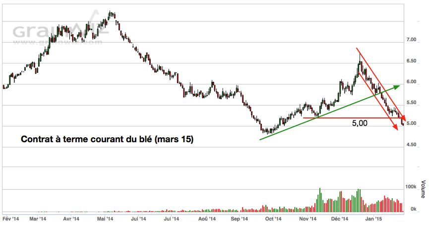À la bourse, le marché du blé à Chicago est toujours dans une fâcheuse posture, écraser par une forte tendance baissière qui ne semble lâcher prise depuis décembre dernier. Il sera cependant intéressant de surveiller de près dans les prochains jours/semaines l’approche du 5,00 $US/boisseau et un éventuel passage sous ce niveau vers le creux de septembre dernier. Les marchés pourraient se montrer beaucoup moins confiants de forcer davantage à la baisse à ces niveaux, d’autant que le marché du blé est dans un contexte fortement « survendu ». Certains chartistes pourraient noter aussi la formation d’une figure de type « wedge » (en français « biseaux ») descendant. Généralement, ce type de figure est un signe qu’un renversement imminent pourrait survenir, dans ce cas-ci à la hausse.