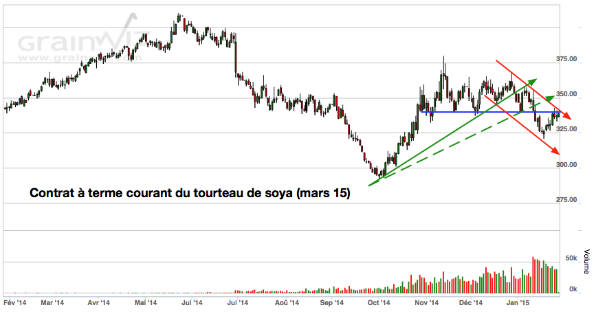 Le marché du tourteau aura pour sa part trouvé un bon support sur lequel s’appuyer à 325 $US la tonne courte pour bondir depuis un peu plus d’une semaine. Malgré ce rebond, la tendance baissière amorcée en décembre reste à l’ordre du jour, bien qu’elle soit mise à l’épreuve.