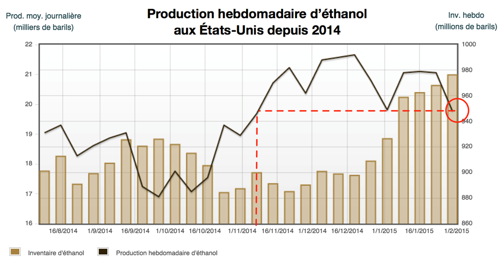 Selon l’EIA (Energy Information Administration), la production d’éthanol a finalement lâché prise, reculant de ses sommets frisant 980 000 à 990 000 barils/jour à 948 000 barils/jour la semaine dernière. Il s’agit du plus faible niveau enregistré depuis novembre dernier. Ce recul n’est cependant pas surprenant, tenant compte que les marges des fabricants américains d’éthanol sont beaucoup plus serrés qu’elles ne l’étaient au cours de la seconde moitié de 2014, voire même négative. Mais, ce qui préoccupe davantage, ce sont les inventaires d’éthanol qui continuent de s’accumuler, atteignant leur plus haut niveau depuis juin 2012, signe que la consommation du biocarburant ne serait pas au rendez-vous présentement pour écouler la production.