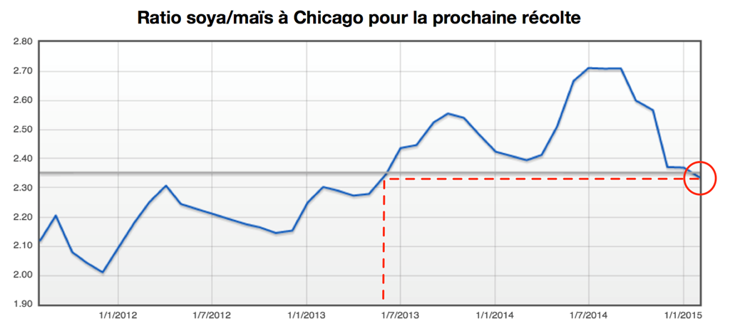 Fait intéressant, le recul plus prononcé du soya comparativement à celui du maïs a fait passer maintenant sous la moyenne des dernières années le ratio soya/maïs pour la prochaine récolte. C’est la 1re fois depuis juin 2013 qu’il passe sous ce niveau. S’il n’y a pas si longtemps, il ne faisait aucun doute que semé du soya se voulait plus intéressant, la situation a maintenant bien changé et rend moins sûr que les producteurs voudront en semer autant que prévu jusqu’ici. Généralement, la perception des marchés est qu’un ratio élevé soya/maïs joue en faveur d’ensemencements en soya, et un ratio faible en faveur d’ensemencements de maïs.
