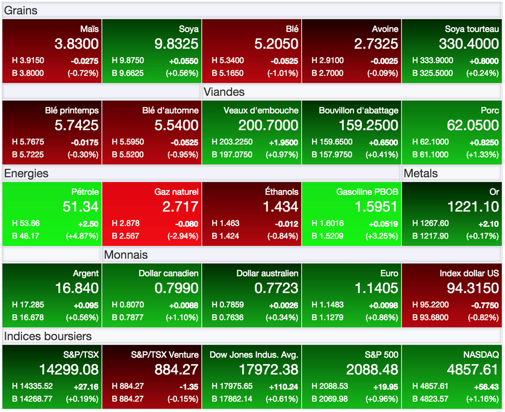 Dans le cas du soya, la situation reste un peu plus incertaine. Ici aussi, une tendance neutre cherche à prendre forme. Par contre, bien qu’elle soit mise à l’épreuve, la tendance baissière en place depuis le début de 2015 restes toujours à l’ordre du jour, avec une bonne résistance à l’approche de 10,00 $US/boisseau. Il faudra surveiller la clôture de la semaine demain qui pourrait dicter davantage le ton.